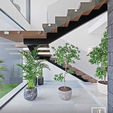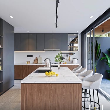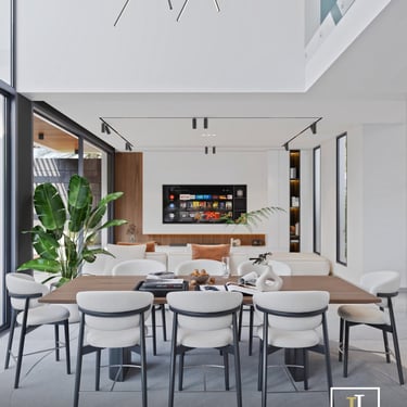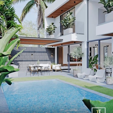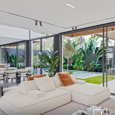 RDC : Jardin, garage, piscine, terrasse, chambre avec SDB, toilette visiteur, buanderie, Salon avec salla à manger et cuisine américaine